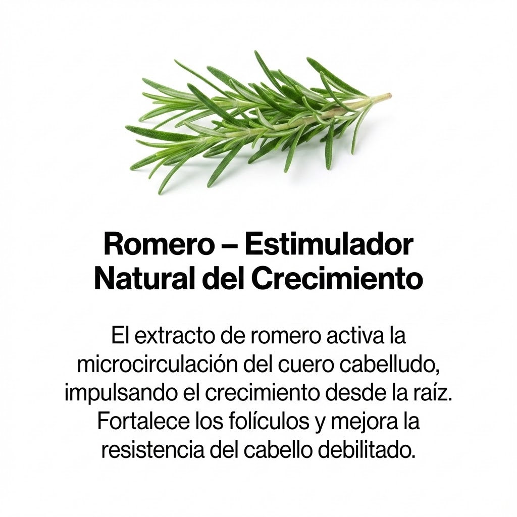 - 🌿 Romero (Oxigenación): Actúa como un vasodilatador natural (similar al Minoxidil pero botánico), incrementando el flujo de oxígeno para nutrir la raíz débil.